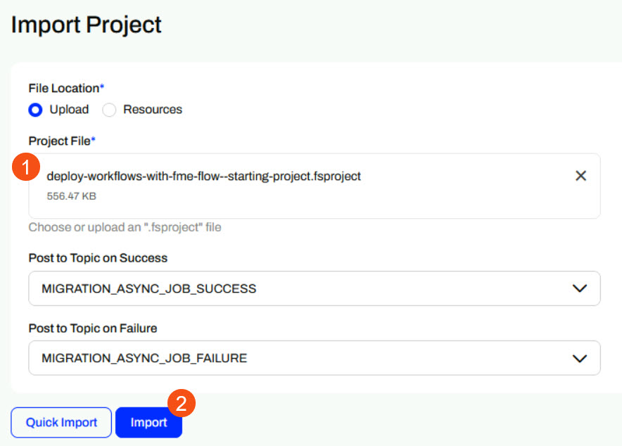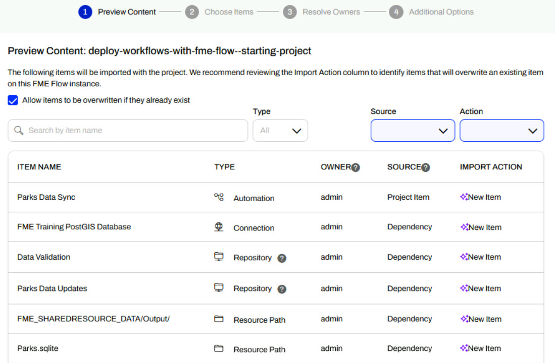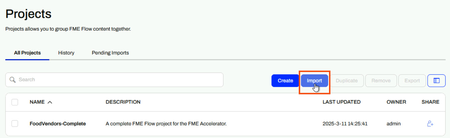If you're completing this lesson with your own FME Flow, you must import the starting project with the content into your FME Flow. If you don't want to import this project on your own FME Flow, you can just read along; however, later exercises in the learning path will require importing projects.