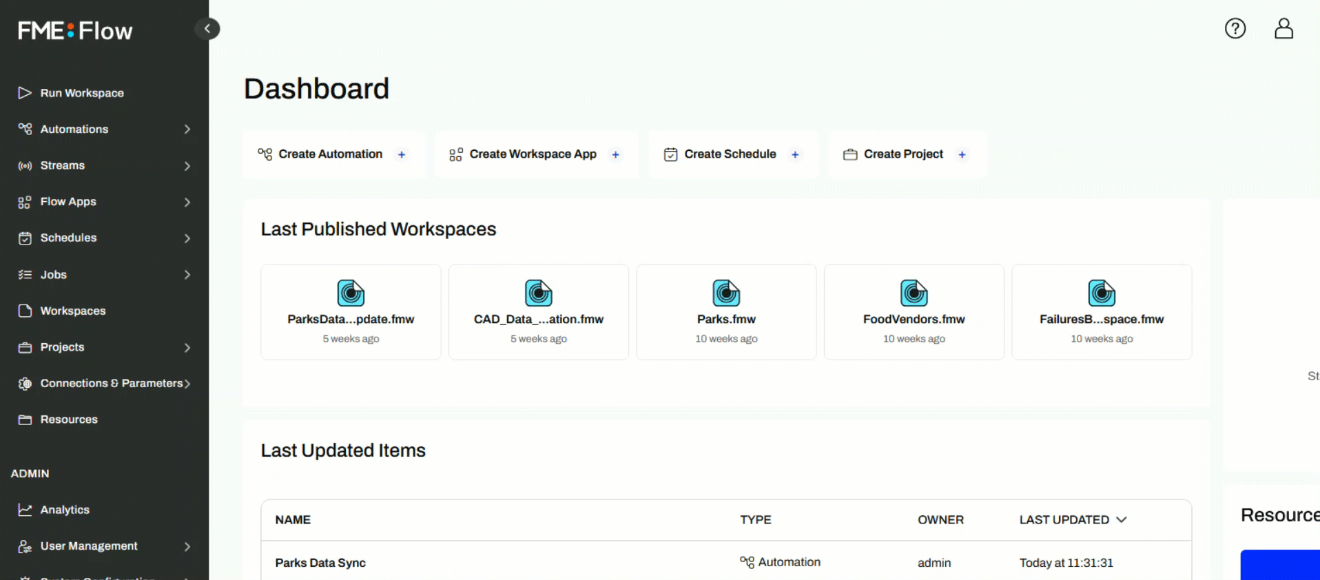 From the FME Flow Dashboard, use the side menu to select Automations and then navigate to the Parks Data Sync Automation.