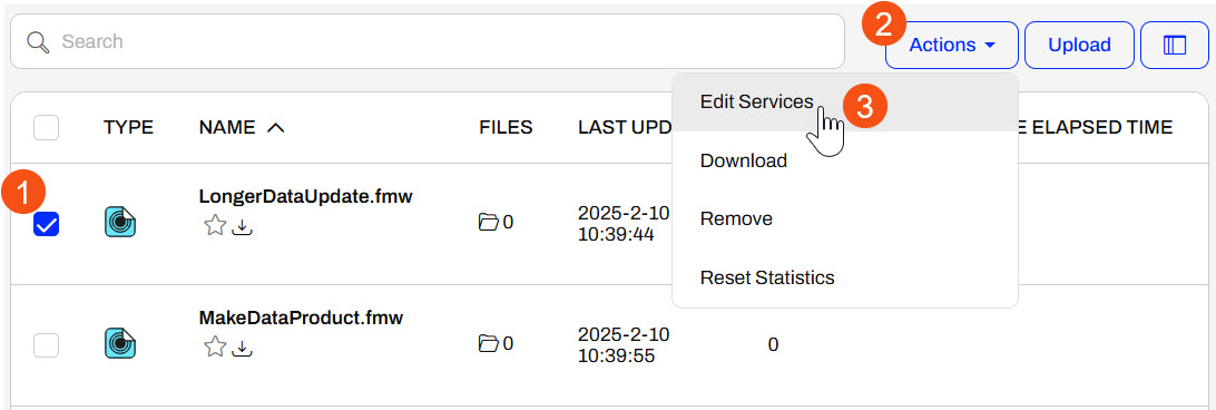 To change a workspace's services on FME Flow, navigate to Workspaces and open the repository housing the workspace. Select the workspace, expand the Actions button, and select Edit Services.