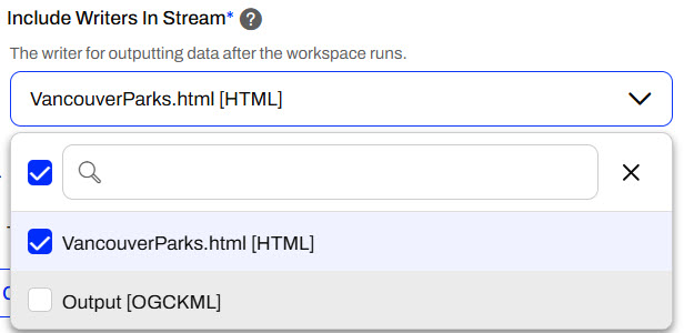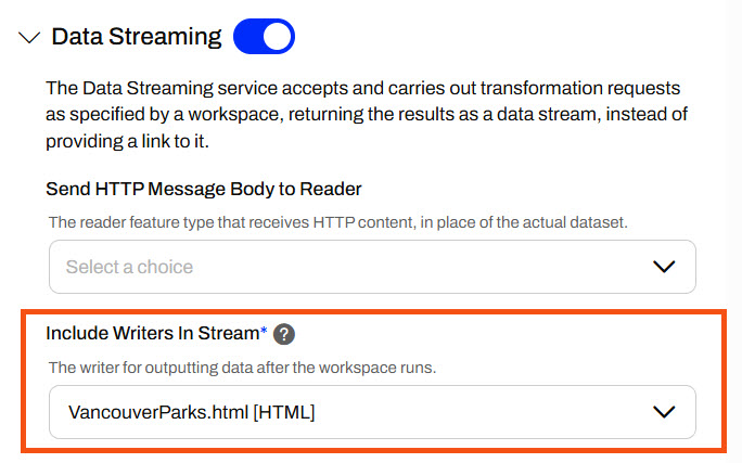 Sven toggles on the Data Streaming service and expands its options. He notices that the KML and HTML writers are included in the stream. Since Sven only wants the HTML report to be streamed back to the user running the workspace, he deselects the KML writer from the list.