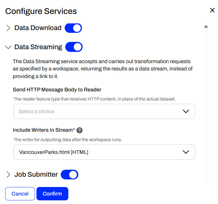 The FME Flow Data Streaming transformation service functions similarly to the Data Download service. However, the Data Streaming service immediately streams a workspace's output data to the user in the browser instead of as a downloadable zip file. Again, the Writers selected for the Data Streaming service do not write the data in the file location you set in the Writer; instead, FME Flow presents the data to the user in the browser upon job completion.