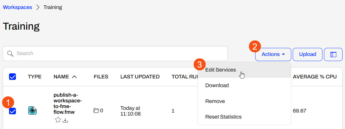 On FME Flow, Sven opens the Workspaces page and selects the Training repository to open it. He checks the box to select his workspace, opens the Actions drop-down menu, and selects Edit Services.