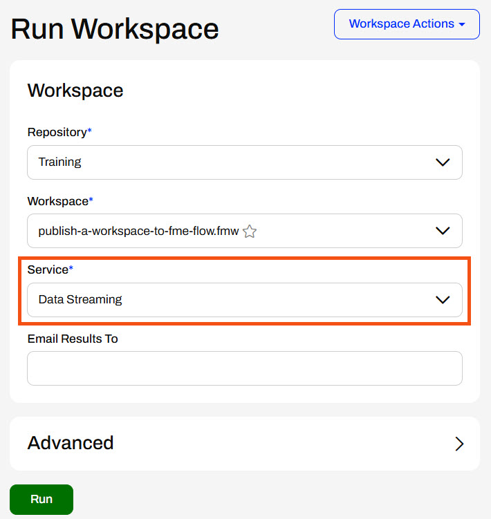 On the Workspaces page, Sven clicks the workspace to open the Run Workspace page. He selects the Data Streaming service and clicks Run.