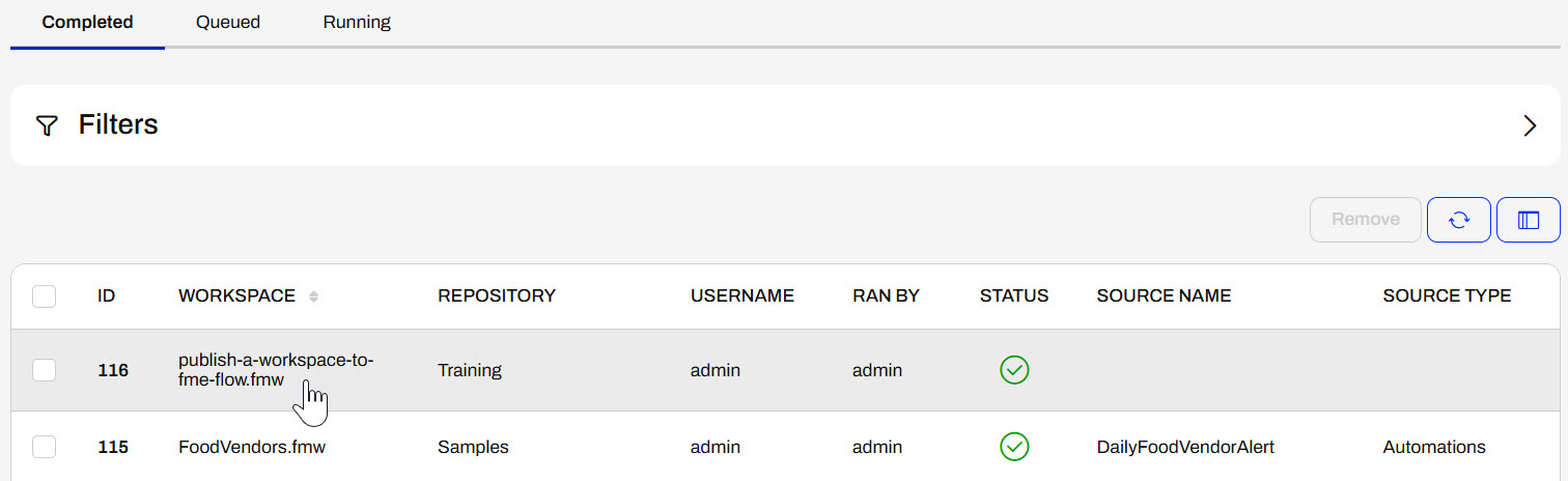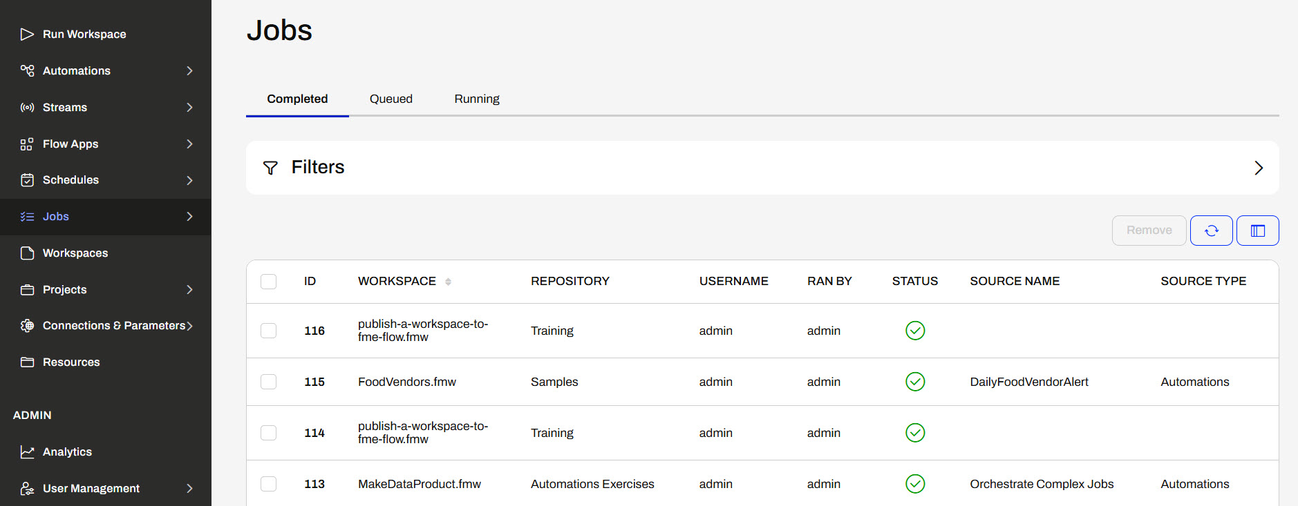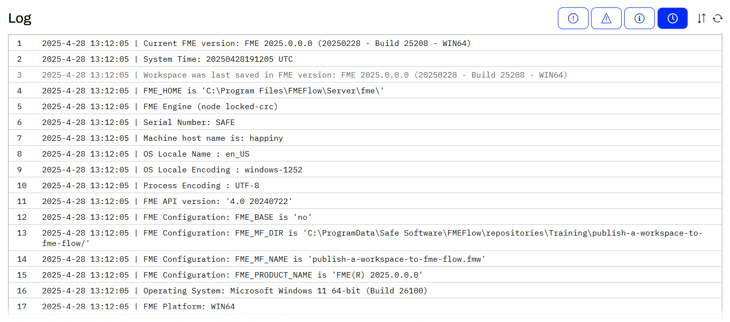 In the last exercise, Sven ran his workspace on FME Flow and saw that it completed successfully. Although the workspace ran successfully, Sven should know where to access more detailed job information for monitoring, development, and troubleshooting.