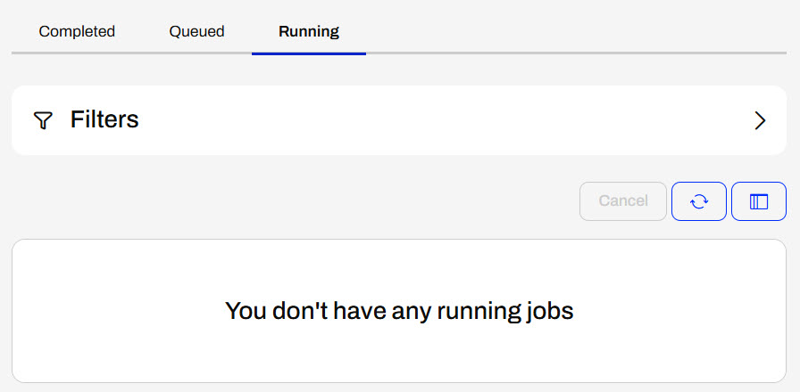 Across the top, you may view jobs currently in the Queued or Running state. If a job is queued, it waits for an available engine to process the translation. The Running section shows jobs that an engine is currently processing. The list will be empty if no jobs are currently in either of these states.