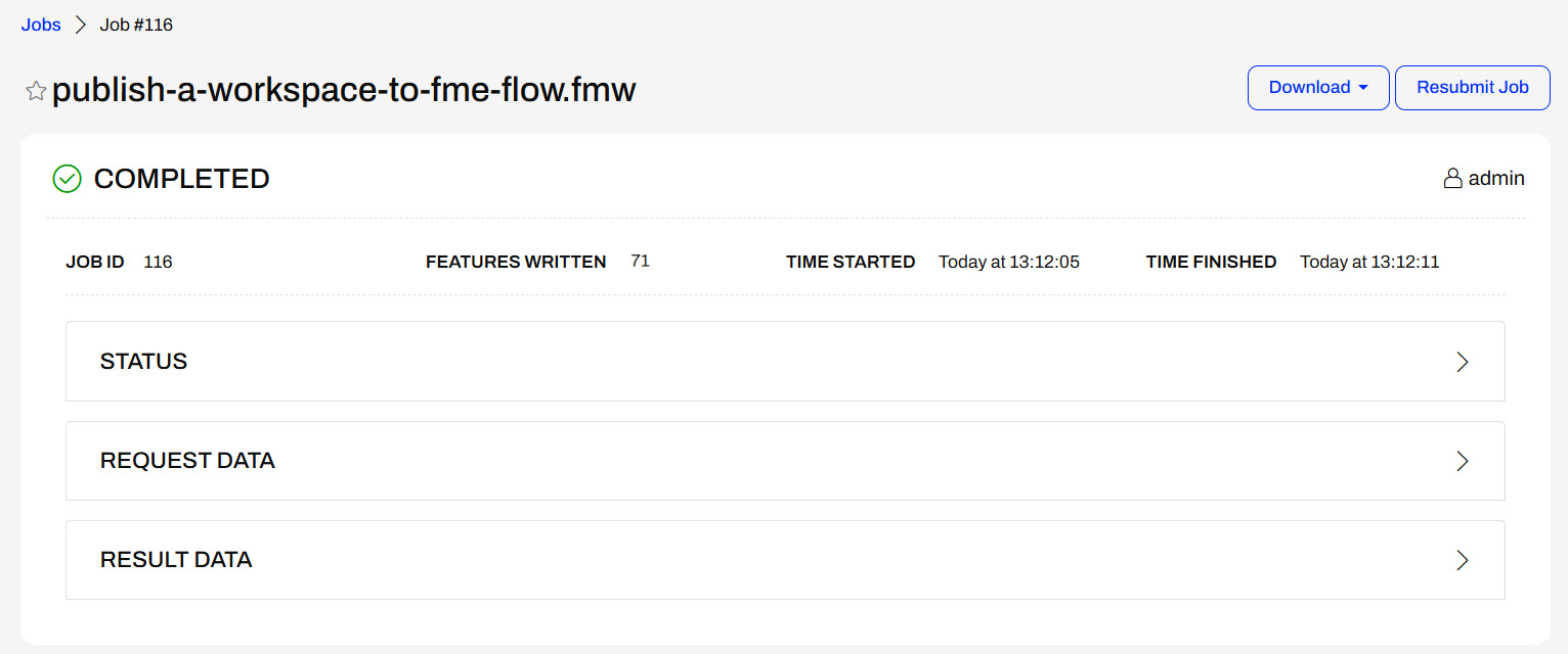 The detailed Jobs page shows more information about the translation and contains expandable sections with even more information. The Status section contains simple statistics about the job. Request Data includes information the FME Flow core passes to the FME Engines to carry out the job request, while Result Data is information about the translation result the Engine passes back to the FME Flow Core.