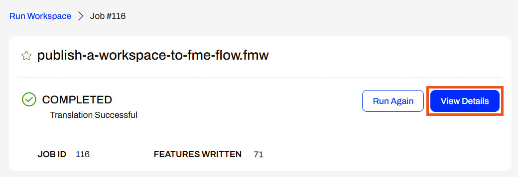 After running a workspace on FME Flow, you can see the translation status from the Run Workspace page. You may also click on View Details to open Jobs and view more information about the job.