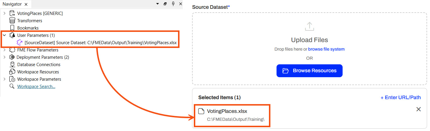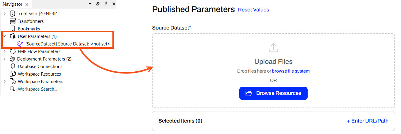 When you publish workspaces to FME Flow, the Reader parameters do not change, and you can only change them if you create Published Parameters. Self-serve workflows benefit from Published Parameters that take source data as user input.