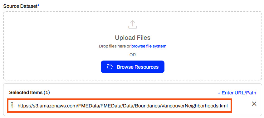 You can enter URLs for datasets hosted online (e.g., a public dataset, an open data portal, or an internal server). When you enter the URL and run the workspace, FME Flow downloads the data directly from the online source. This saves you from downloading it from the online source and then uploading it to FME Flow, and is especially useful for large files. An FME Flow Automation may process data from live links to ensure the most up-to-date data is always used for your workflows.
