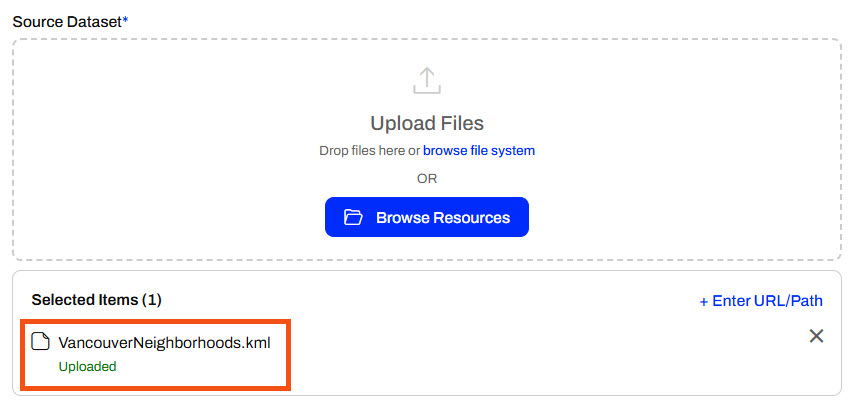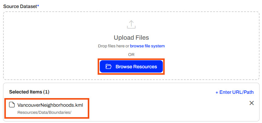 You will want to use the Browse Resources option when the source file is already uploaded to FME Flow's Resources, such as in the Data or Temp folders. It's ideal to store data in Resources if the file will be used across multiple jobs or workflows to avoid repeated uploads, ensure consistency, and support shared access.
