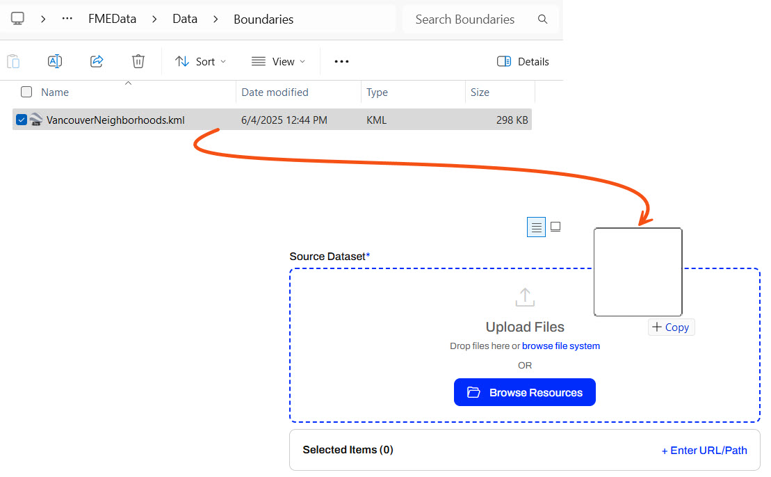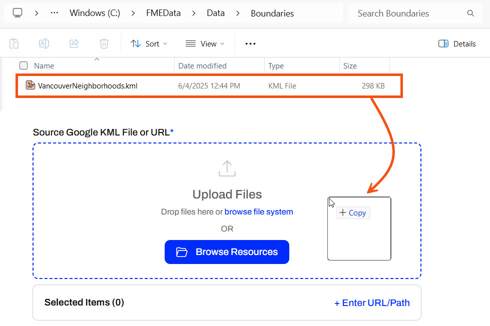 Under Published Parameters, Sven needs to add the KML file first. Sven opens the Windows File Explorer and navigates to VancouverNeighborhoods.kml (C:\FMEData\Data\Boundaries\VancouverNeighborhoods.kml). He drags the KML file onto the Upload Files area of the Source Google KML File or URL parameter and drops it there.
