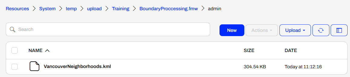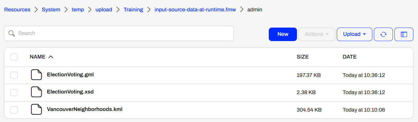 To review his temporarily uploaded files, Sven navigates to Resources > System > temp > upload > Training > input-source-data-at-runtime.fmw > admin.