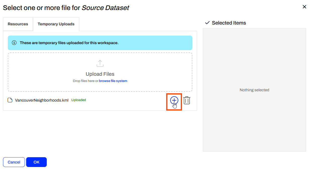 Suppose you rerun the workspace before the clean-up task removes the temporary data. In that case, you can select previously uploaded files for the workspace by clicking the Browse Resources option in the source file parameter and navigating to the Temporary Uploads tab. You may select the file as the source dataset to run the workspace again.