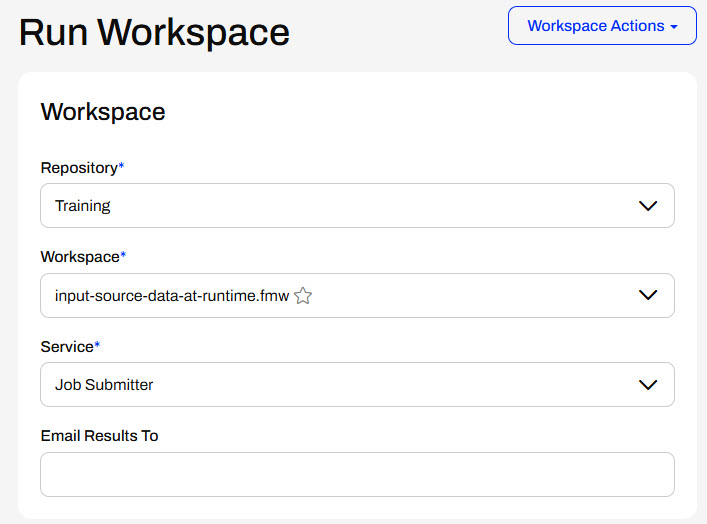 If you provide a default value to the user parameter, FME Flow displays it in the Published Parameters when running the workspace. The end-user running the workspace can keep the default value or supply a different source dataset.