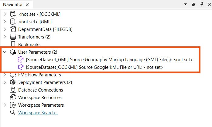 To collect user input for the source data, Sven accepts the data on FME Flow using parameters. Sven expands the User Parameters section in the Navigator window to inspect the parameters, one for each Reader.