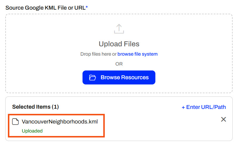 In FME 2025.0.1, there is a bug that disables the Run button once the ElectionVoting.gml and ElectionVoting.xsd files have been added to Temporary Uploads. If you encounter this, refresh the browser page and select the KML and GML files from Temporary Uploads in Browse Resources again.