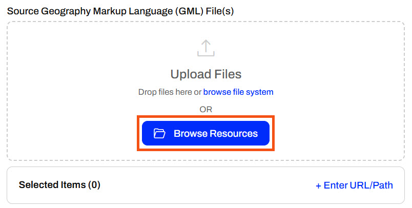 For the Source GML File, Sven knows that GML files need accompanying XSD (XML Schema Definition) files to interpret correctly. This means he needs to input the GML file as the source to the workspace and have the supporting XSD file in the same directory. To upload both files as Temporary Uploads, Sven doesn't drop both files as input; instead, he clicks Browse Resources.