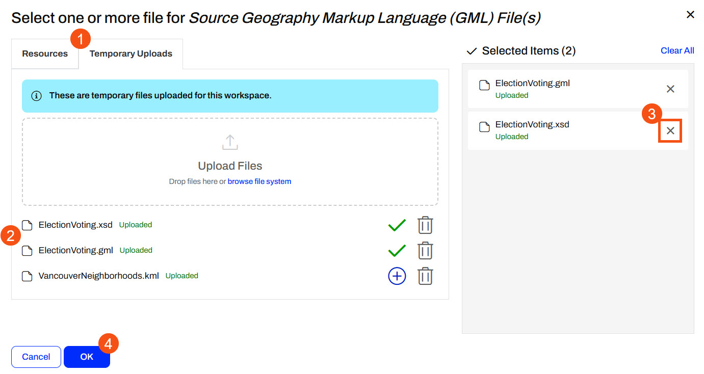 Sven goes to the Temporary Uploads tab. He drags both ElectionVoting.gml and ElectionVoting.xsd (C:\FMEData\Data\Elections) files to the Upload Files area. Because he only needs the ElectionVoting.gml file as the source file, he deselects the XSD file in the Selected Items column. The VancouverNeighborhoods.kml file Sven uploaded in the previous step is also listed in Temporary Uploads since FME Flow stores the uploaded files in the same location. So, FME Flow stores the ElectionVoting.xsd file in the Temporary Uploads location, but does not make it a source file input to the workspace.