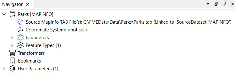 In this workspace, the source dataset is a MapInfo TAB dataset stored on the local computer drive.