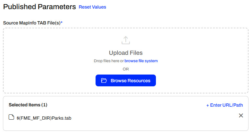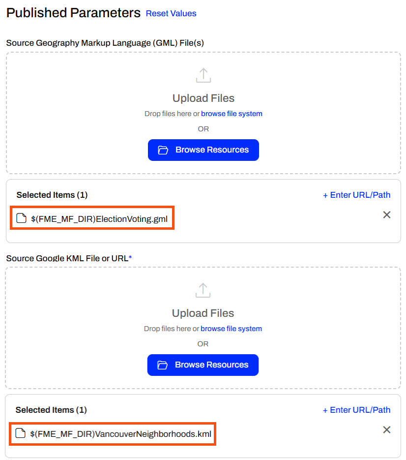 When you run a workspace published with its data on FME Flow, the uploaded data is automatically used as the workspace's source data. The $(FME_MF_DIR) parameter references the repository for the selected workspace.
