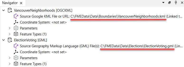 In FME Workbench, Sven expands the parameters for each reader. The source files are stored locally on his computer. For testing on an FME Flow installed locally on his machine, FME Flow can access these files. However, an organizational FME Flow deployment usually won't have access to local file systems except for the server on which it is installed.
