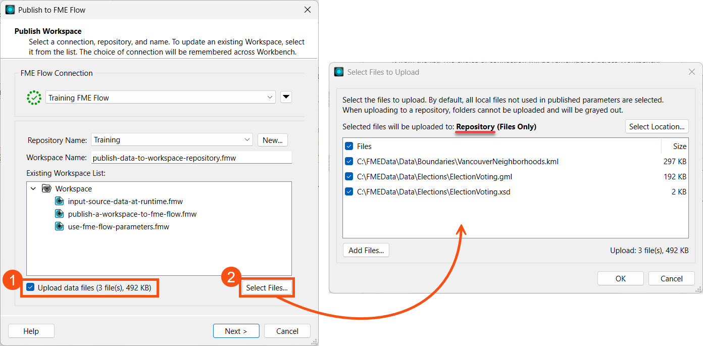 He selects the Training repository, creates it if needed, and leaves the workspace name as the default. He clicks Upload data files and notes that FME automatically selects the three files. He clicks Select Files... to inspect them.