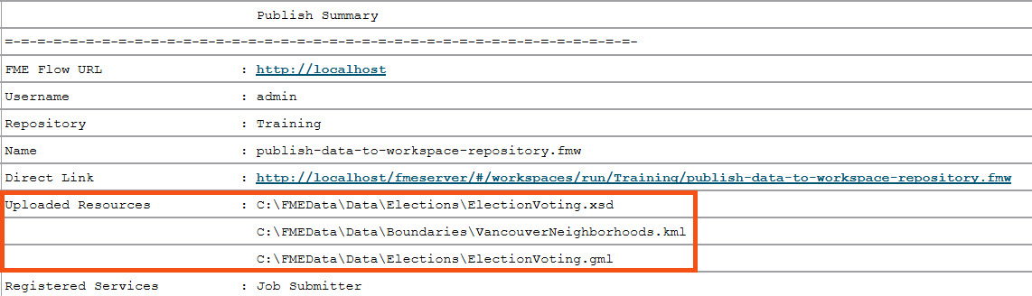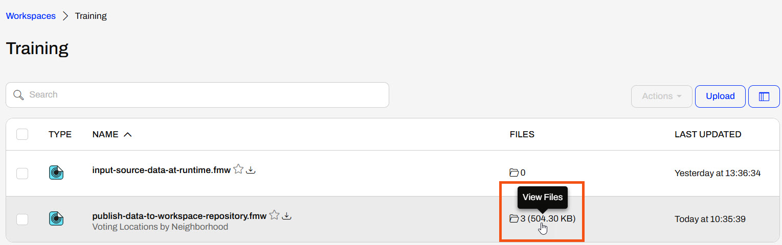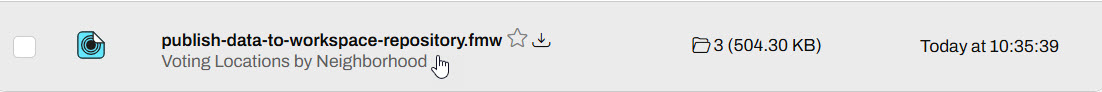 Once the publishing wizard is complete, FME uploads the files to FME Flow, which makes them accessible along with this workspace.
