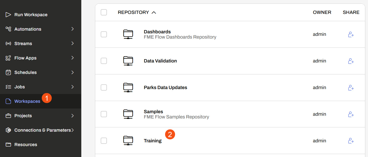 Sven navigates to FME Flow. He opens Workspaces and clicks the Training repository to open it.