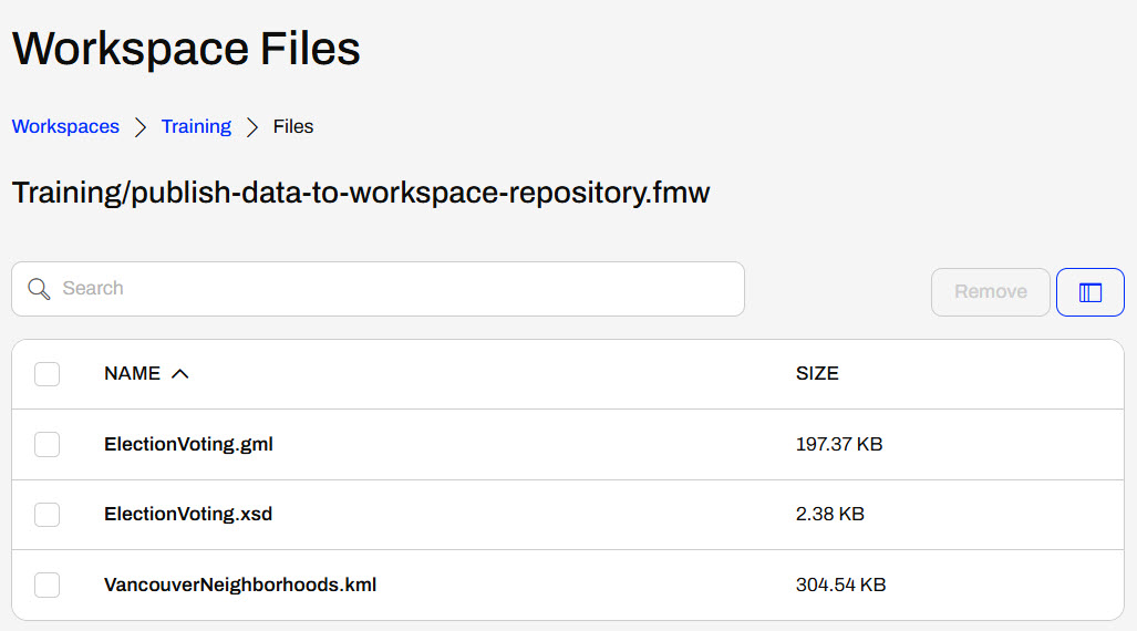 One of the simplest methods for storing source data for FME Flow workspaces is publishing data to a repository. When the source data for a translation is file-based (rather than a feed or database), you may publish the data to an FME Flow repository along with the workspace. This data upload method is fast and straightforward, but it limits future access to the data for other workflows. It's better practice to publish your data in the Resources folder, separate from the workspace, which you will learn in the next lessons.