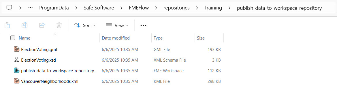 Since Sven has access to the FME Flow computer itself, he opens a file browser and browses to the location where FME Flow stores the repository data. The default location is C:\ProgramData\Safe Software\FMEFlow\repositories\Training, which is consistent with the Safe Software training machines.