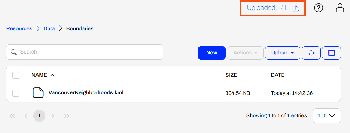 Once FME Flow finishes uploading the file, it will display the count of completed uploads at the top of the page.