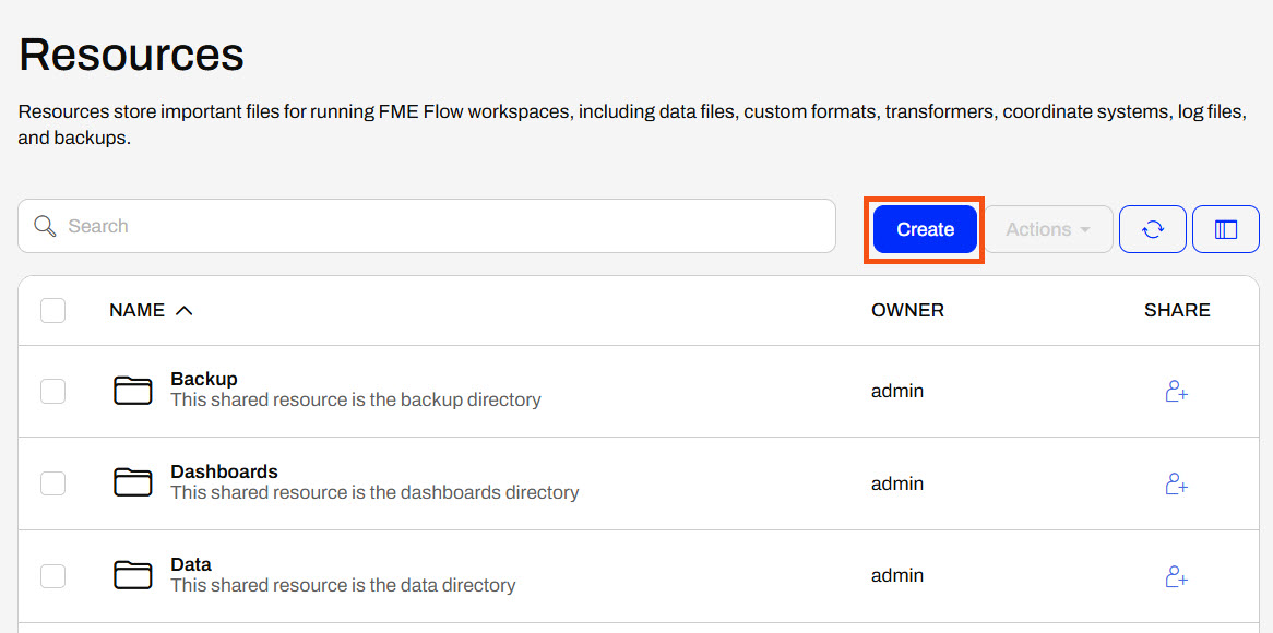 FME Flow can connect to network-based resource locations and Amazon S3 file systems through Resource Connections. You create Resource Connections directly from the Resources page on FME Flow.