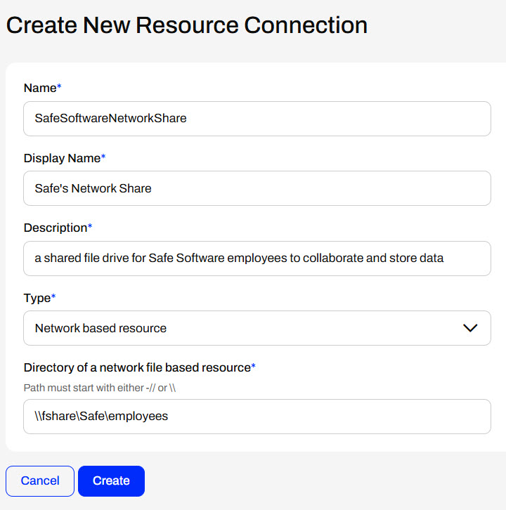 The FME Flow Service Account needs full permissions for network-based resource drives to access, read, and write from the network drive location so that FME Flow can connect and use data from the location successfully. Once you grant permissions to the service account, mapping FME Flow to the network shared file location is as easy as entering the UNC path to the location.