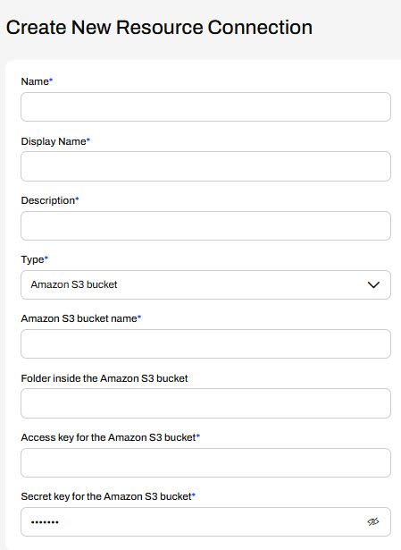 To create an Amazon S3 Resource Connection, you need to enter the bucket name and valid access and secret keys for the S3 location.