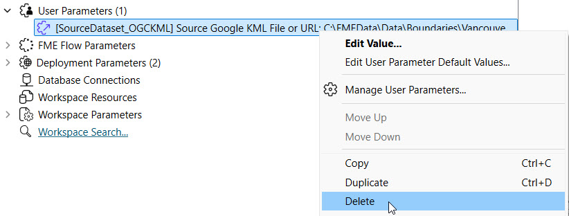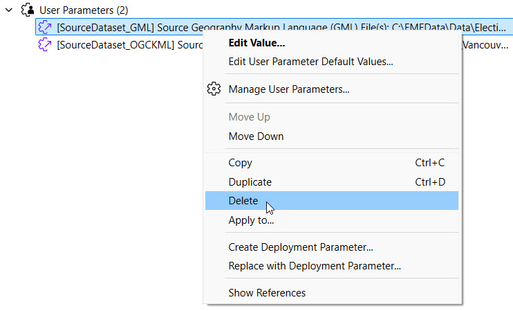 The workspace currently has user parameters to take source files as input for the KML and GML readers. Sven doesn't want end-users to be able to alter the workspace's source data anymore, so he removes both user parameters. In the Navigator, Sven expands User Parameters, right-clicks each, and deletes them.