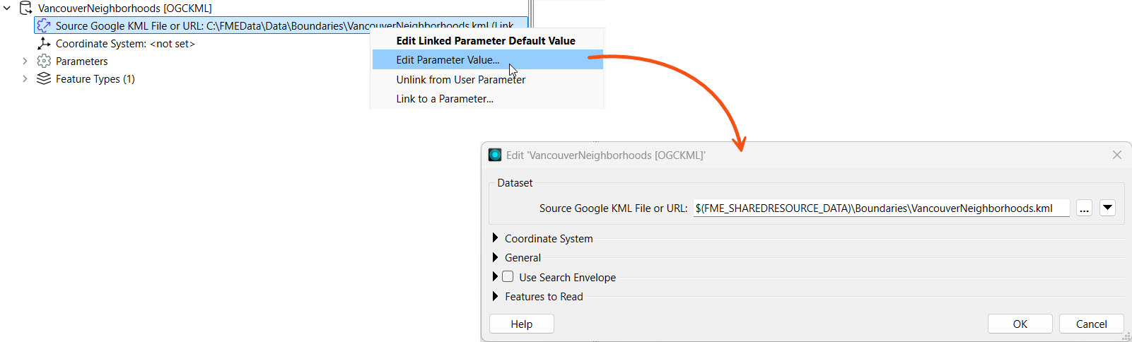 Sven returns to FME Workbench and edits the Source Google KML File or URL parameter for the VancouverNeighborhoods reader. He pastes the System Path value for the KML file.