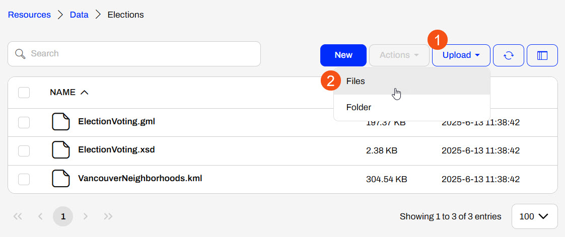 Sven navigates to Resouces > Data > Elections. He has an updated GML file of voting locations. Sven clicks Upload and selects Files.