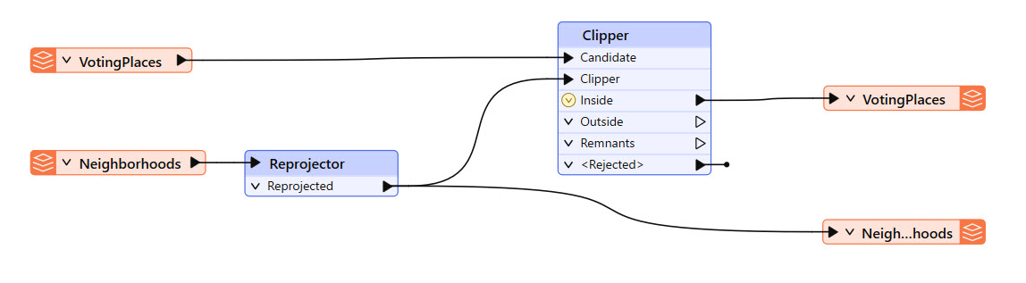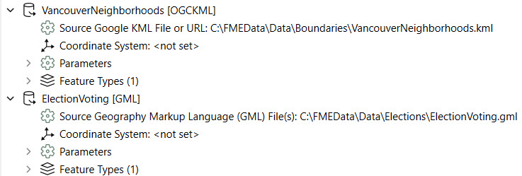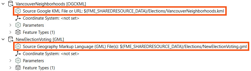 Both source files link to the files stored in Resources > Data > Elections on FME Flow. The $(FME_SHAREDRESOURCE_DATA) parameter denotes this. Neither source file connects to a user parameter, so the end-user cannot alter the source file values on FME Flow.