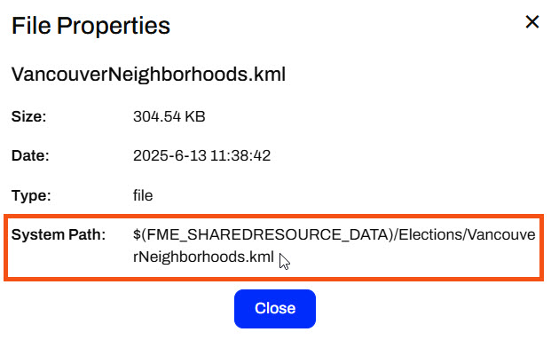 The data you upload to Resources is available to all workspaces and users with permission to access Resources when running workspaces. For example, you use the VancouverNeighborhoods.kml file as source data for multiple workflows, and you only need to store one copy of the file in Resources for multiple workspaces to use.