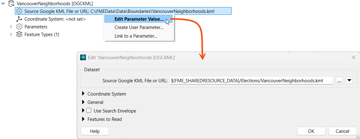 Remember that the Flow parameter FME_SHAREDRESOURCE_DATA includes the Data folder in its path. For example, the source KML file value is FME_SHAREDRESOURCE_DATA\Boundaries\VancouverNeighborhoods.kml not FME_SHAREDRESOURCE_DATA\Data\Boundaries\VancouverNeighborhoods.kml. The easiest way to find the entire path to a Resources dataset is inspecting it's properties on FME Flow and copying the path into the workspace reader parameter.