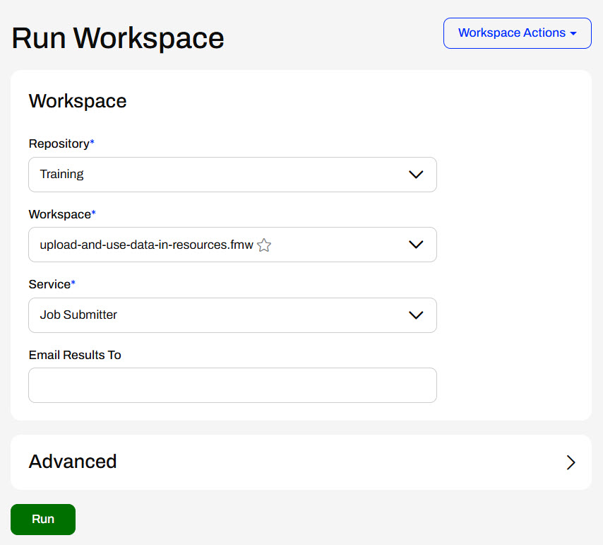 Sven opens the Run Workspace page and selects the workspace he just published. Since Sven removed the User Parameters, there are no Published Parameters to configure. Sven clicks Run to run the workspace, which uses the source data stored in Resources.