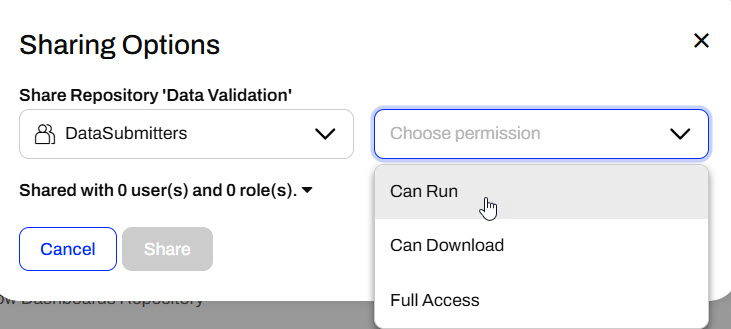 Users and roles also impact FME Flow security. Roles are analogous to a group of users. When sharing an item, you may select a combination of users and roles to give permissions. For example, you can give anyone in the fmeuser role the ability to run workspaces in a repository.