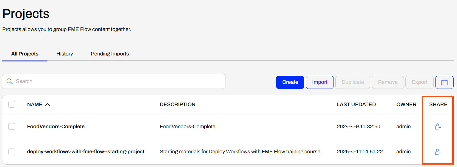If you're completing this lesson with your own FME Flow, you must import the starting project with the content into your FME Flow. If you don't want to import this project on your own FME Flow, you can use existing content that you've created or Samples workspaces to share content.