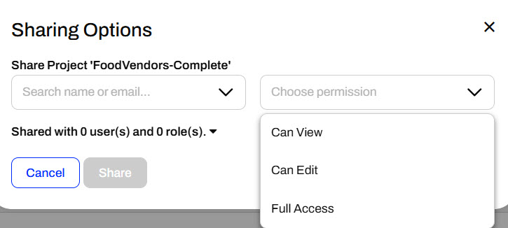 You share other items on FME Flow the same way you share repositories. The only options that differ are the level of permissions that you may grant to the user or role you're sharing with. For example, you can share Projects, which group FME Flow content together. The permissions options include options to view and edit the project, which differ from the Can Run and Can Download options for repositories. You will learn more about Projects in the following lessons of this course.