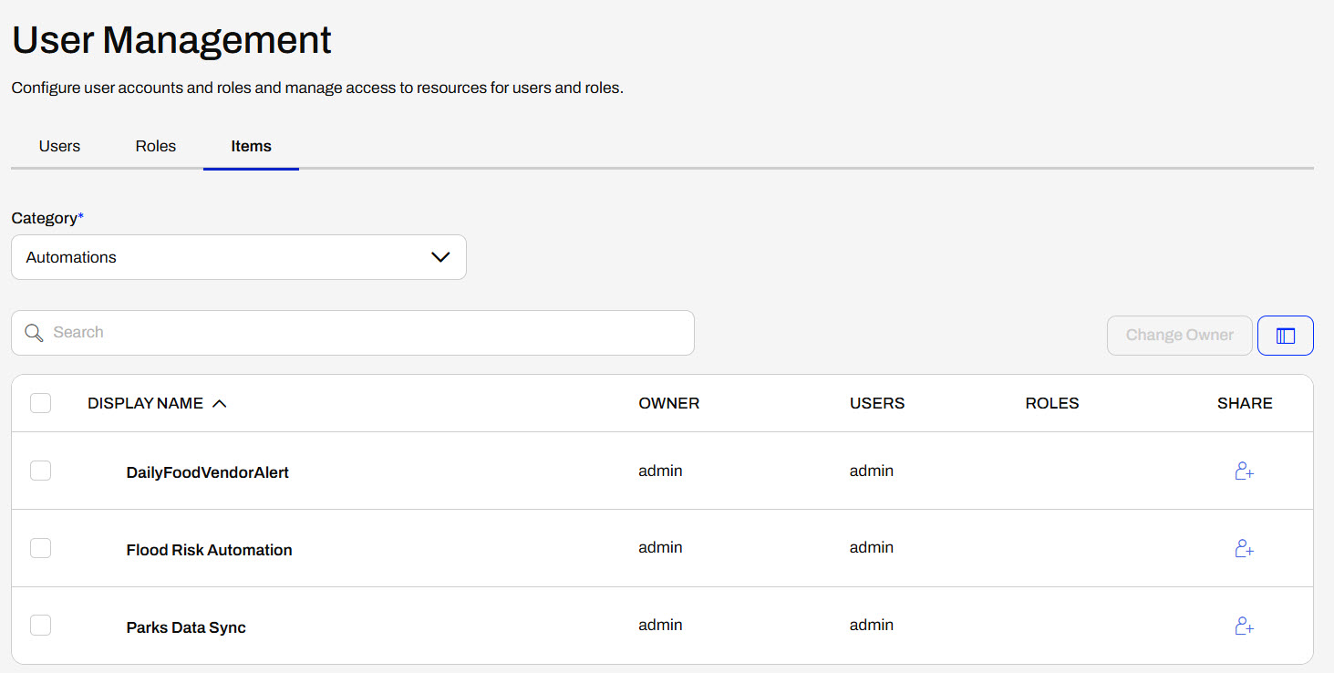 For items, you would select the content category on FME Flow and then grant permissions by sharing items to users or roles. You will see the same Sharing Options here when sharing from the item itself.