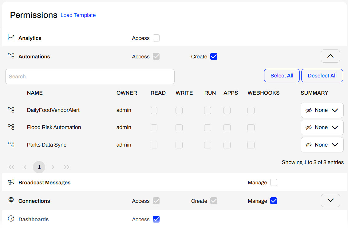 An FME Flow administrator may also manage access to items directly in User Management through Users, Roles, or Items. Permissions for users and roles work the same. You may grant permissions to all features and functions of FME Flow, or on an item basis. Some features have different levels of permissions, including Access, Create, and Manage.