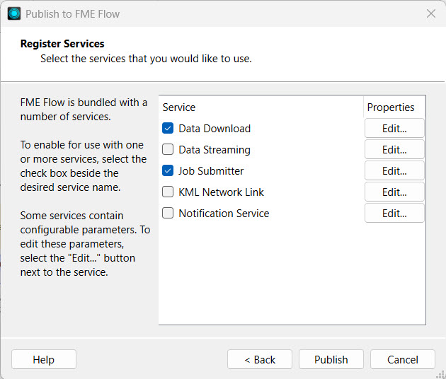 Jennifer publishes her workspace to FME Flow, puts it in the Training repository, and registers it with both the Data Download and Job Submitter services.