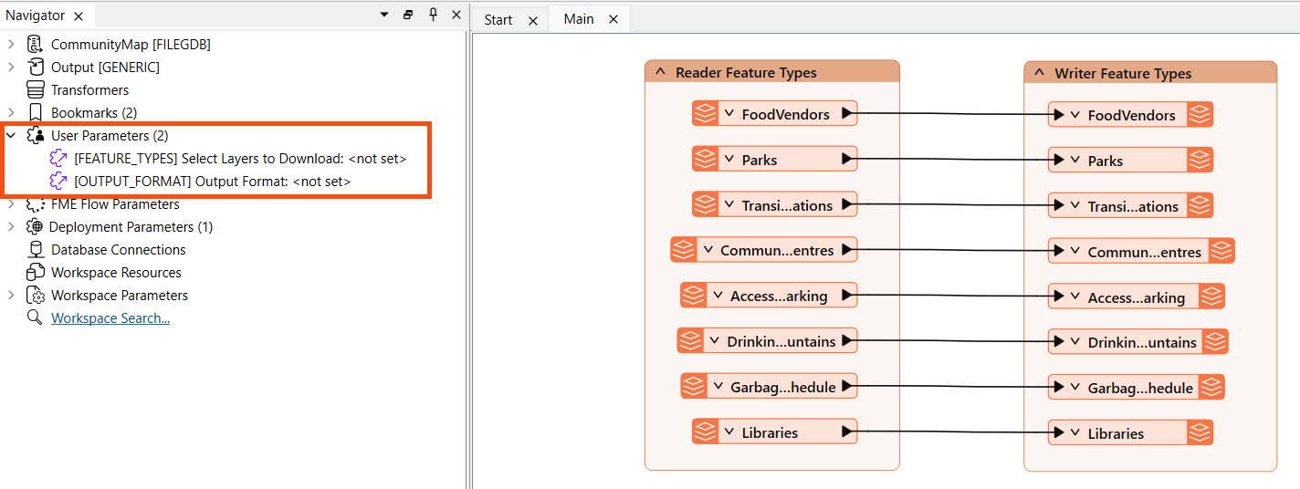 Jennifer opens her workspace in FME Workbench (C:\FMEData\Workspaces\DeployWorkflowsWithFMEFlow\share-workspaces-as-apps.fmw). The workspace reads data from a CommunityMap file geodatabase and writes it using a generic writer. Jennifer has already created two user parameters: FEATURE_TYPES to allow the user to select the feature types from the database to access, and OUTPUT_FORMAT to control the format in which the output data is delivered.