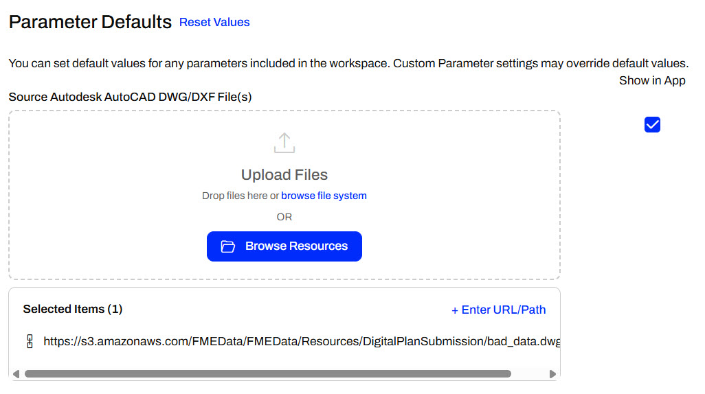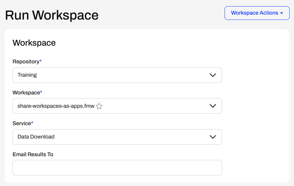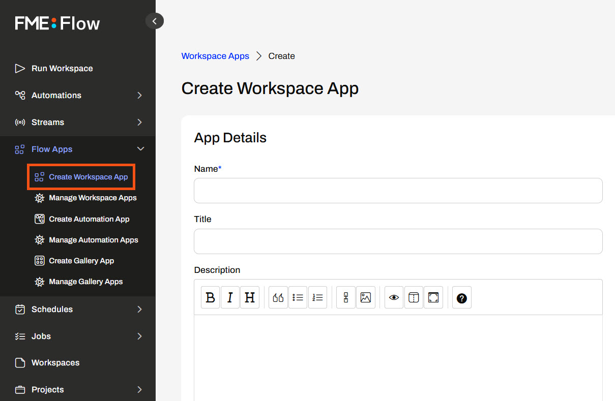 The FME Flow Workspace App link will open a simplified Run Workspace page.