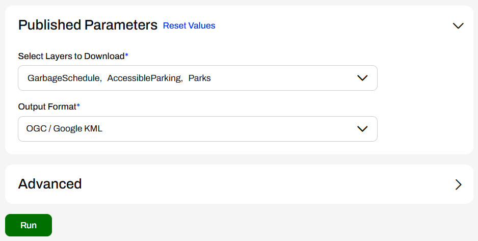 Then, she clicks the URL to open the App in a new tab. She selects some layers to download and clicks Run to run the App, which runs her workspace behind the scenes.